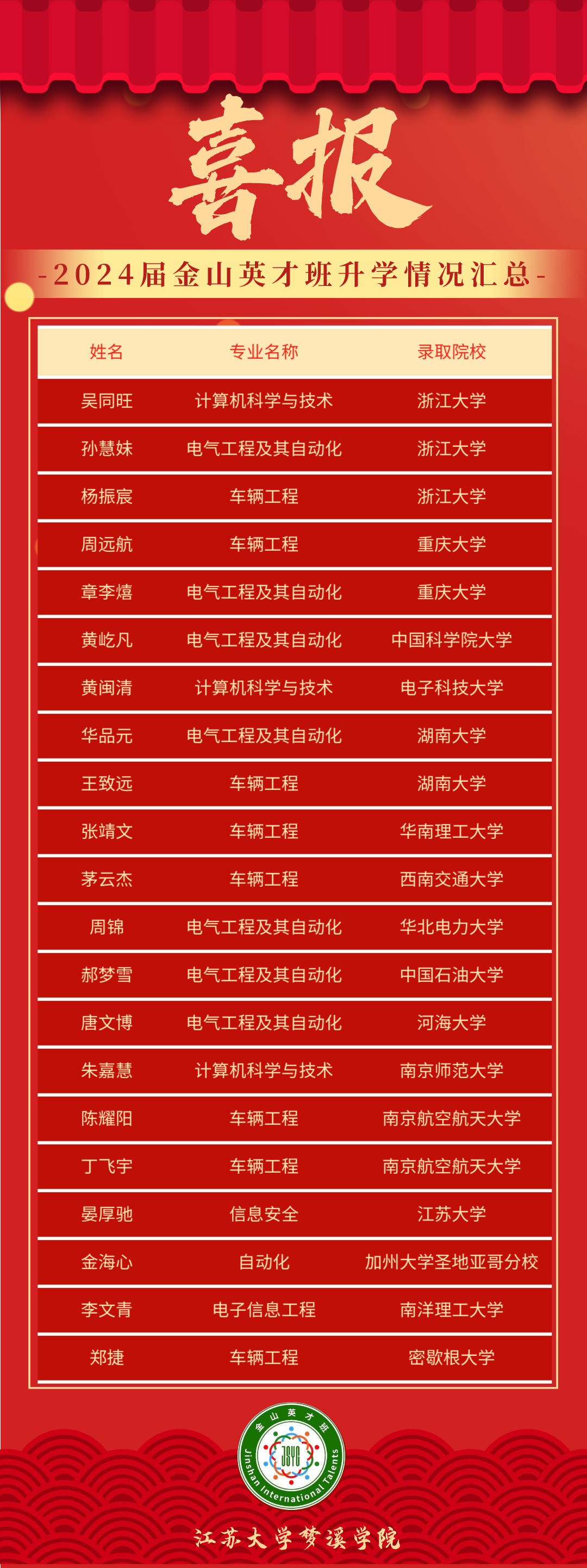 喜报|九游 2024届金山英才班升学情况汇总